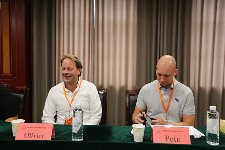 OLivier訪問湘佳食品產業園 9月20日上午,荷蘭梅恩公司亞太區總監Olivier、產品經理Pete、業務經理潘偉奇一行專程前來湘佳牧業參觀訪問。荷蘭梅恩公司是世界著名的家禽屠宰加工設備制造商,產品遍布全球90多個國家和地區。來到湘佳食品產業園,Olivier一行參觀了湘佳文化長廊、流水生產線、質控監測中心。湘佳食品產業園副總經理孫元盛全程陪同,熱情地向客人們介紹了現代化屠宰冷鏈生產線的相關情
